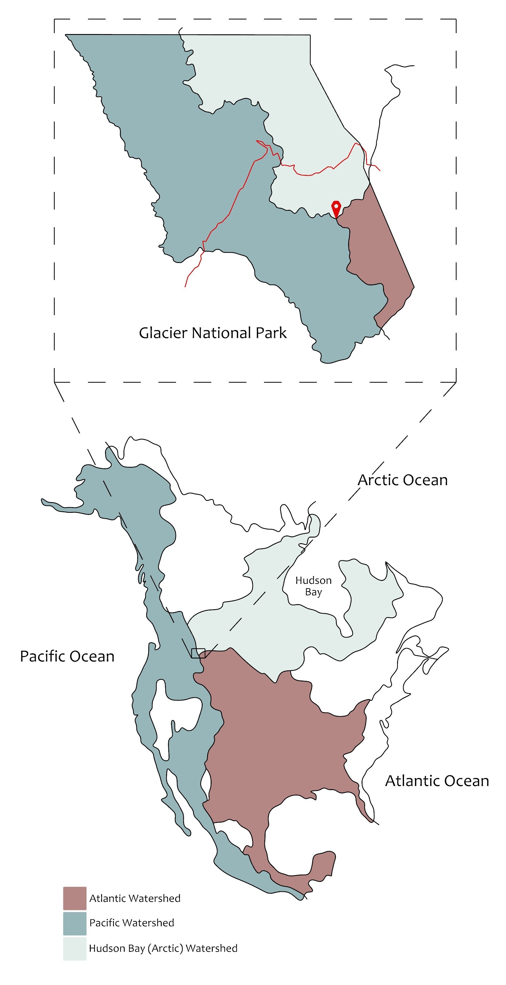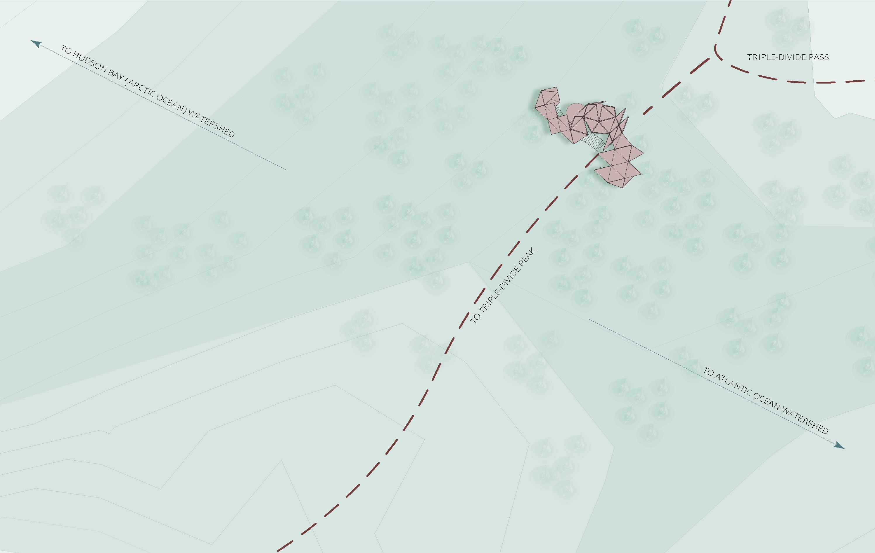 A site between Triple-Divide Peak and Triple-Divide Pass in Glacier National Park was selected because of its narrative potential, logistical feasibility and formal intrigue. Near a popular hiking trail, Triple-Divide Peak is where the Pacific, Atlantic and Hudson Bay watersheds meet. This project straddles the former two watersheds, and acts as a gateway towards the third. This site's unique hydrological condition only exists in three other locations in North America, with only one other sitting in a primarily untouched, natural environment. This rarity makes it a perfect staging ground for our project’s intended confrontation between real-life natural hydrological systems and Plato’s building block of water, the icosahedron.