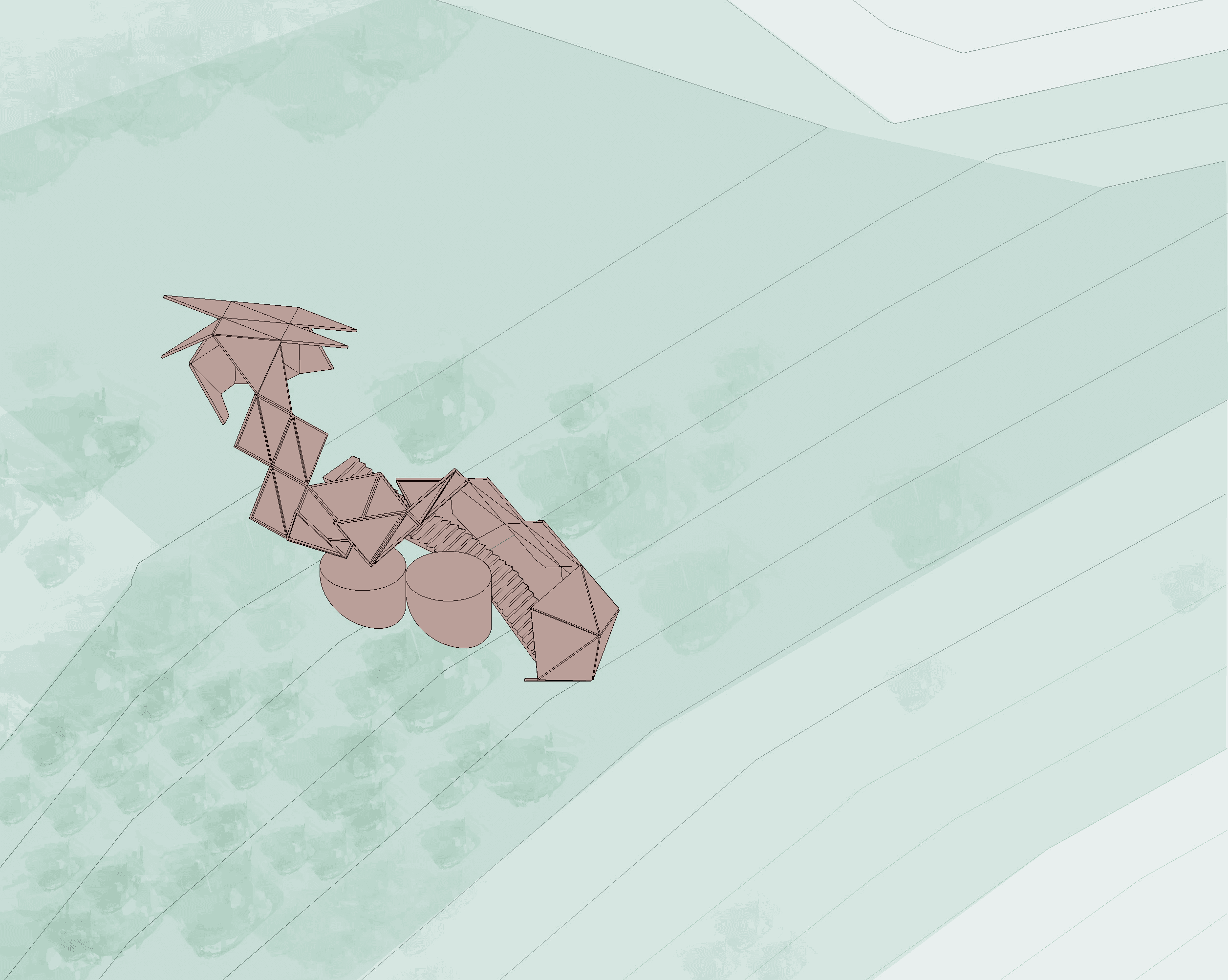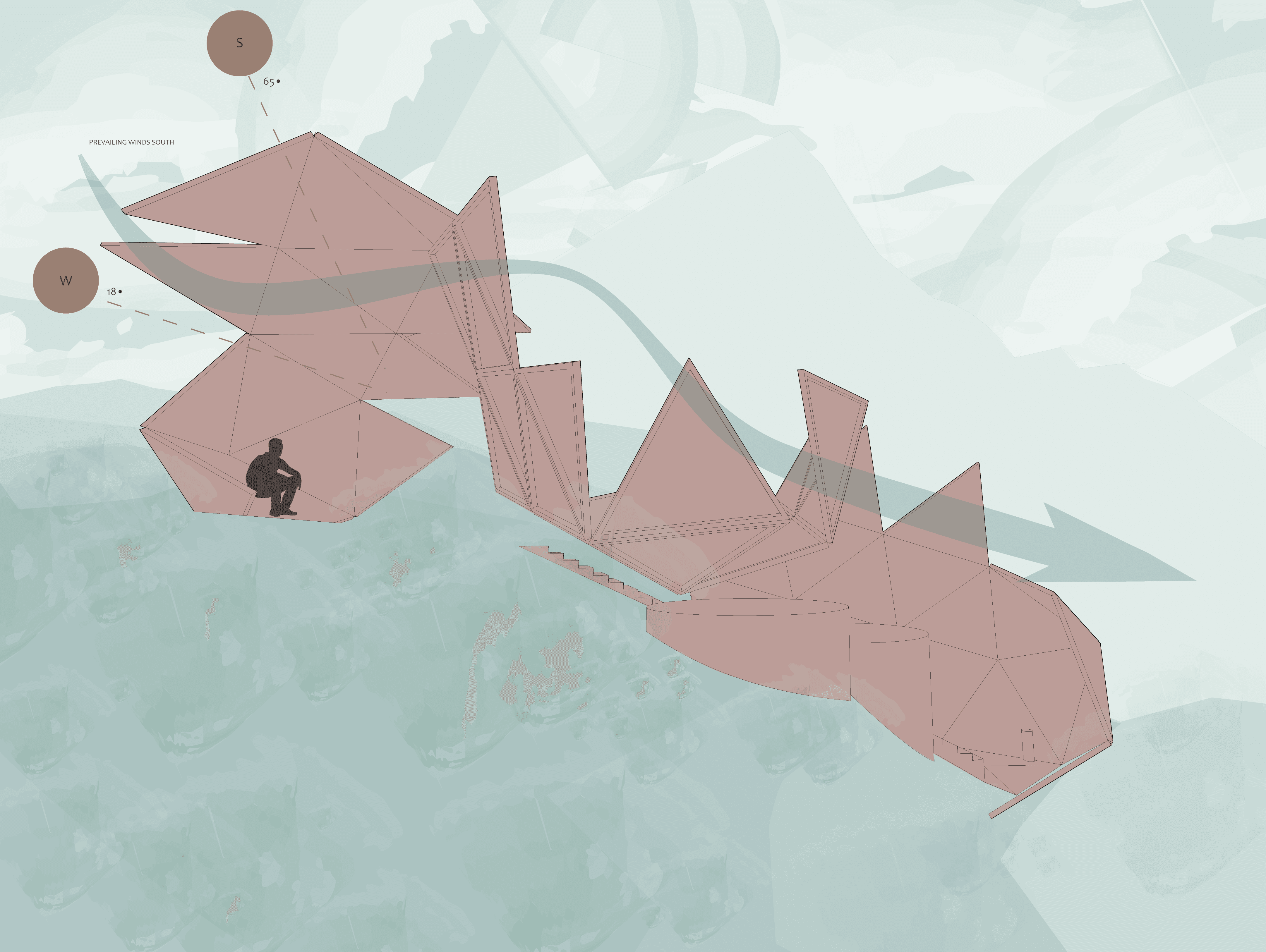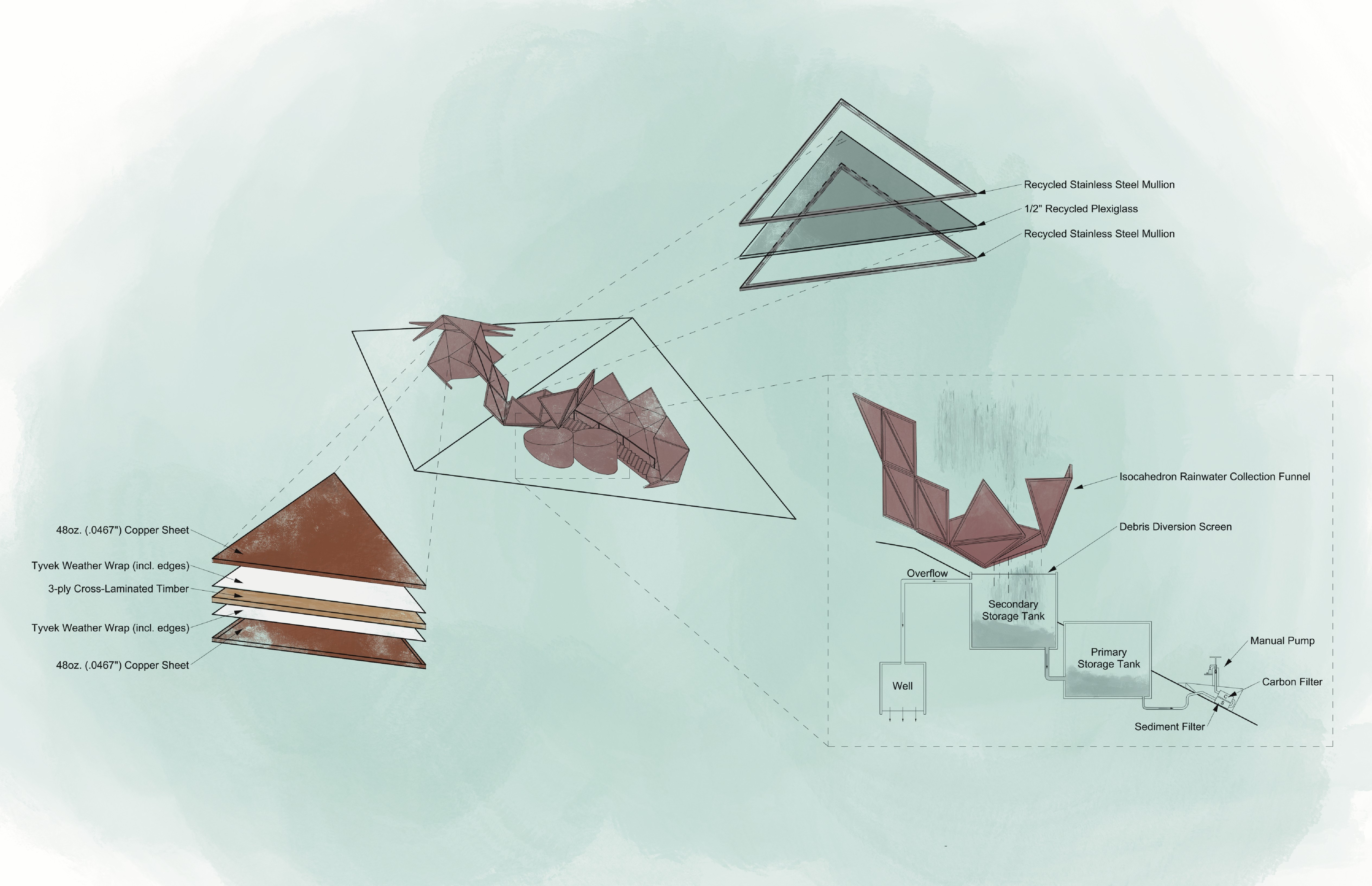 The Design-Build Student Competition challenged students to design and produce an outdoor art installation, as well as create documents that outlined tectonics, budget and practical concerns with fabrication. The theme for 2025 was “Sacred Geometry: Platonic Solids,” having students incorporate Plato’s ideas of sacred geometry into the project. Plato believed the icosahedron was the building block of water, so this project’s form is synthesized from a vocabulary of deconstructed icosahedrons, and programmatically adapted to act as a gateway, shelter and rainwater funnel for hikers. It’s implications are continent-sized, with this project confronting 3 different watersheds that travel across North America — to the Pacific, Atlantic and Arctic Oceans.