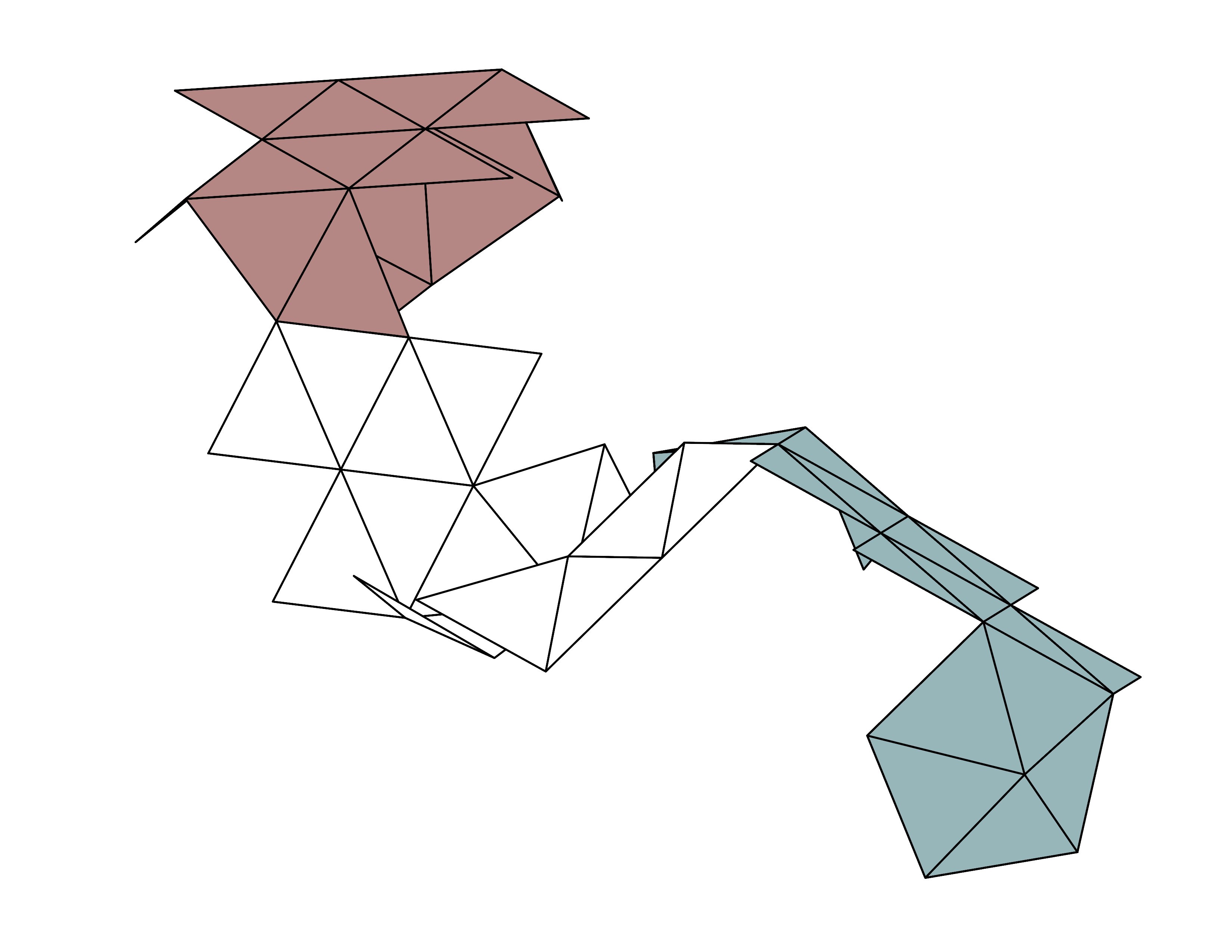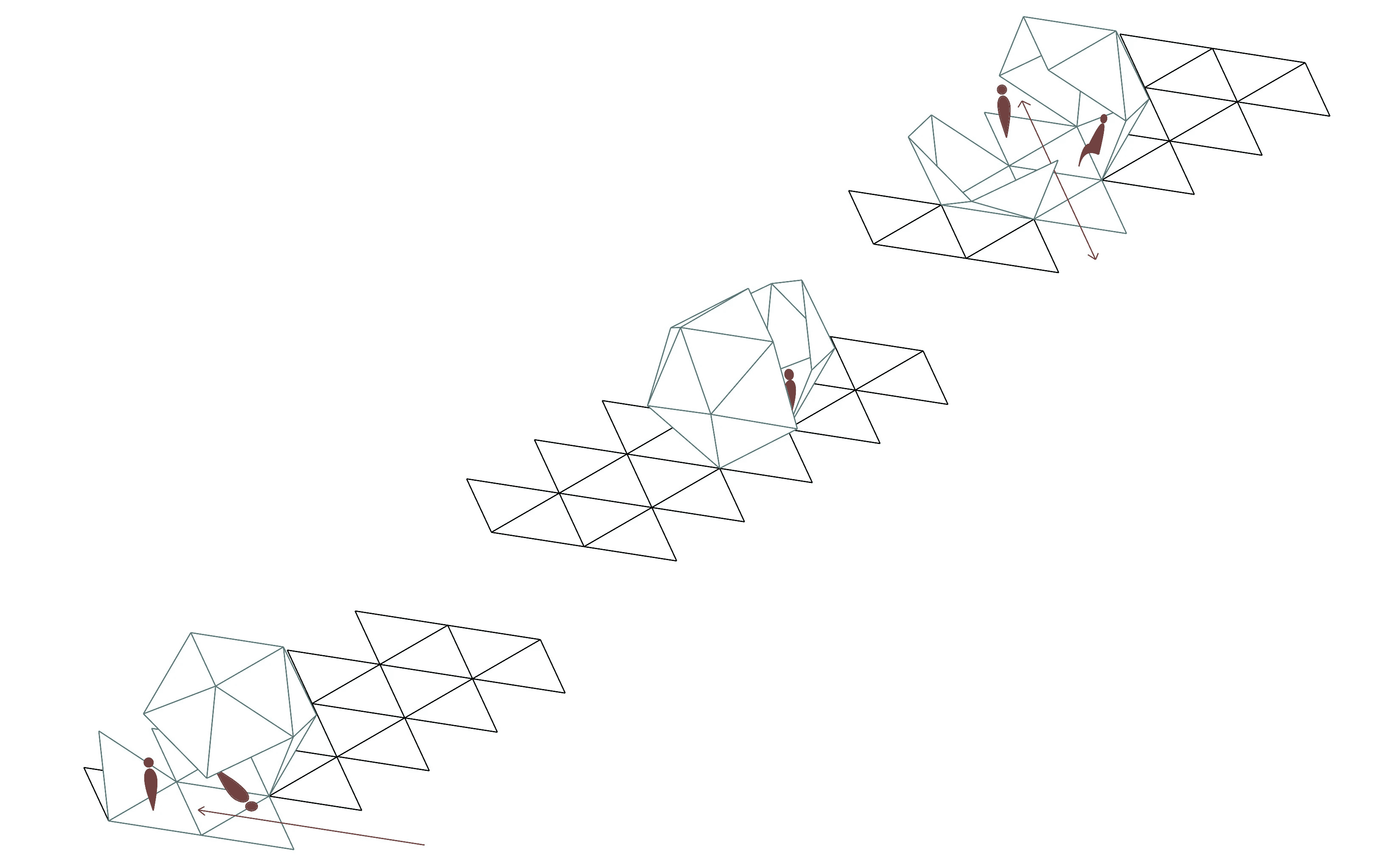 Plato's Icosahedron is unfolded systematically from each end, creating a full vocabulary of the shape's permutations (Below). From this vocabulary, selected permutations are assessed for possible programmatic and circulatory implications (Above). Three permutations were selected and linked together to create the project's main form (Right).