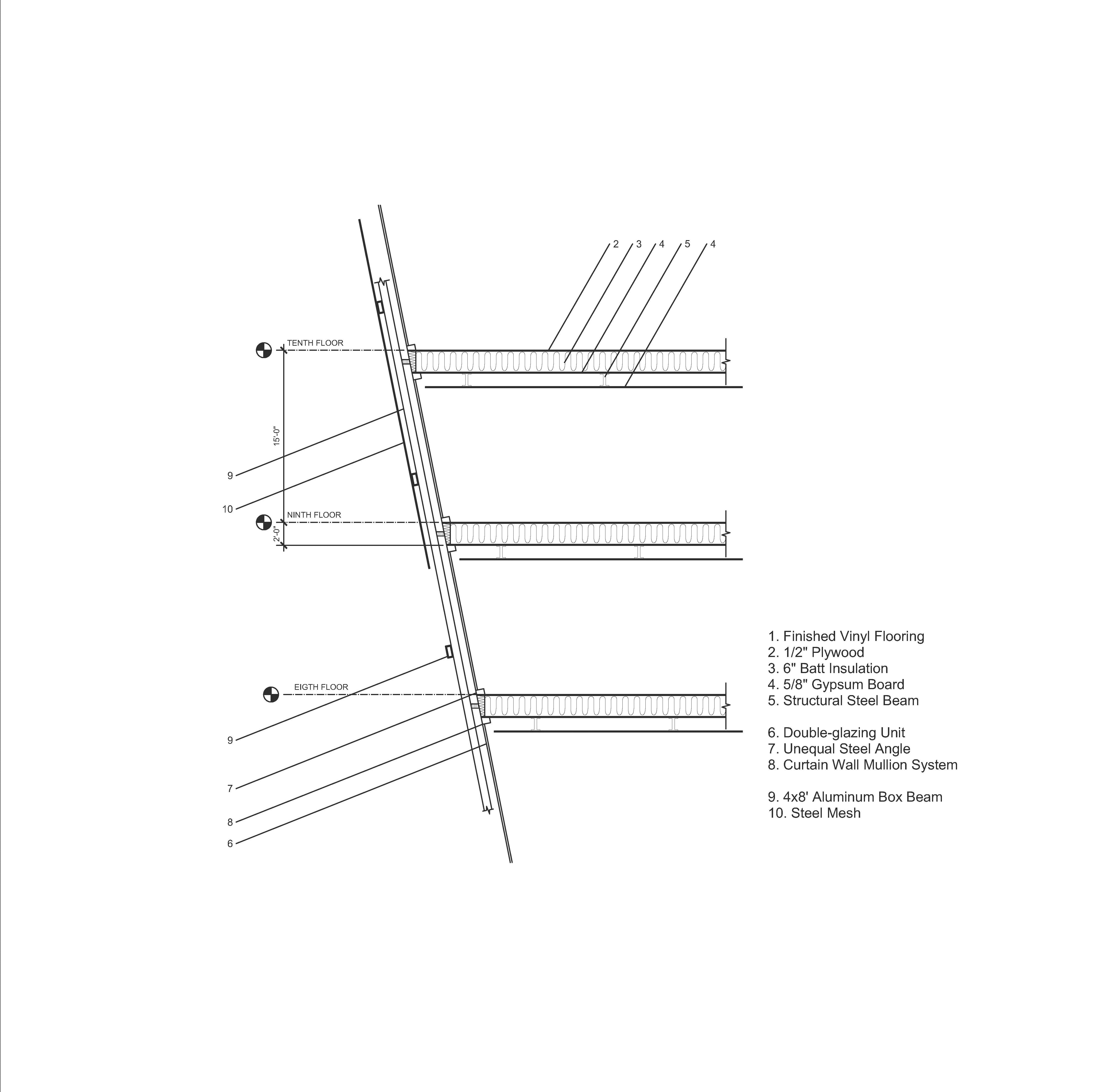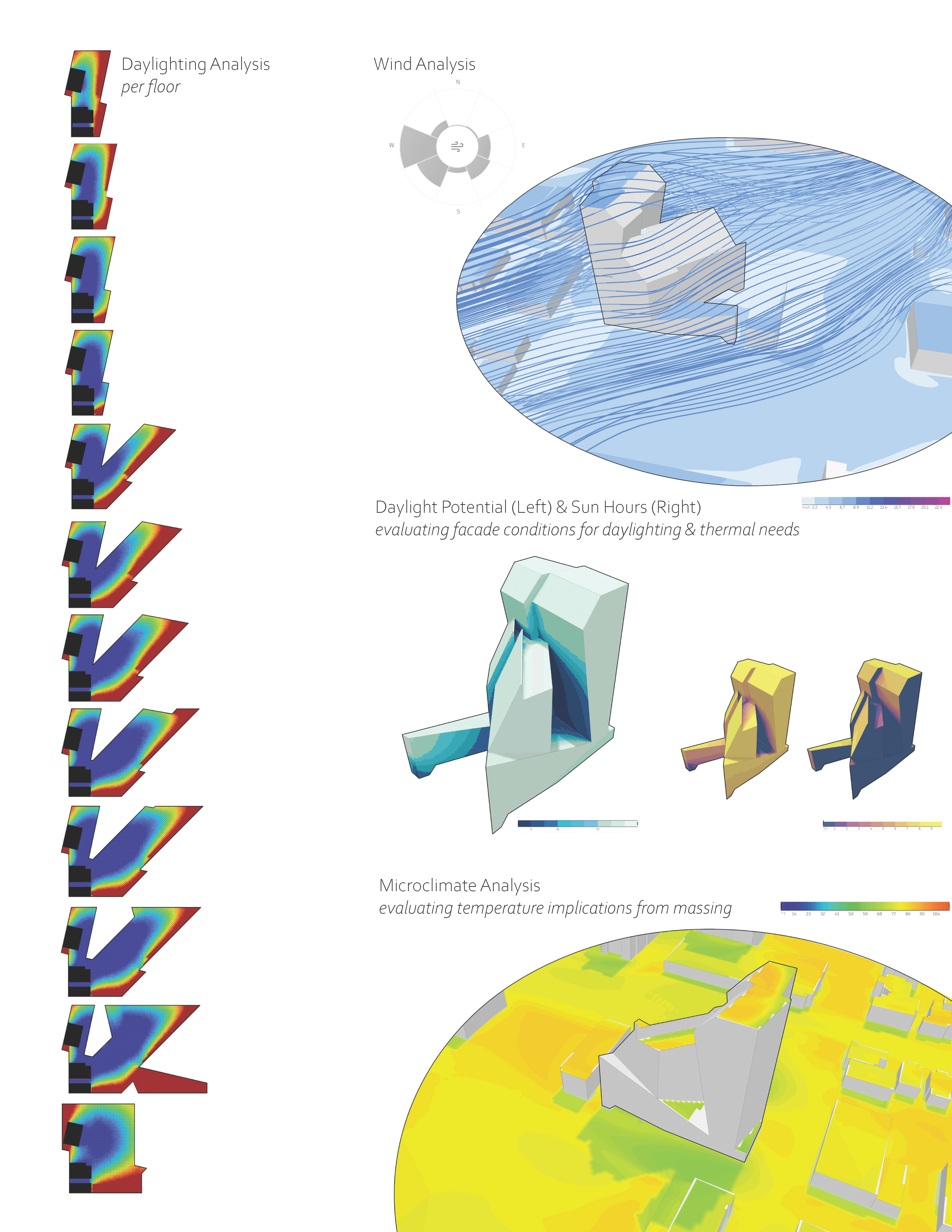 In the 2000’s, the average class for the Cal Poly Pomona Architecture department was 70-100 students. In 2025, there's 200. With a growing student body and pressure from the state to grow even more, the students were tasked with envisioning a 12-story studio tower, with expanded space for study, collaboration and design. The site was in a unique location, in the heart of Downtown Pomona, 5 miles away from the main campus and surrounded by parking lots and the African American Alliance. With a unique location and program, this project employs unique solutions to fulfil it’s program’s needs. This project also features a multi-layered HSS facade made of a patchwork of steel mesh, corrugated metal and frosted glass, whose composition responds to the various environmental needs of each surface.