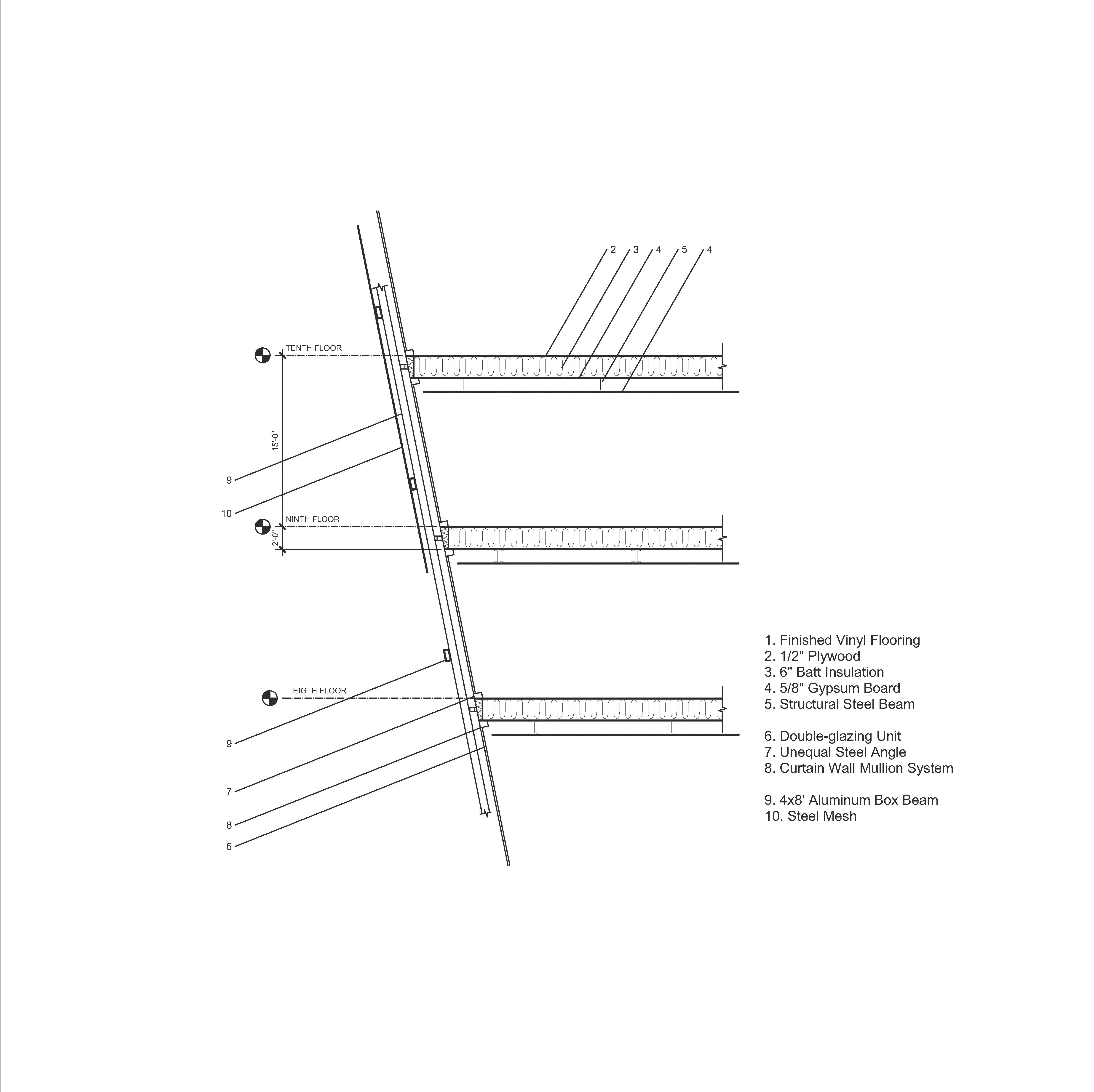 In the 2000’s, the average class for the Cal Poly Pomona Architecture department was 70-100 students. In 2025, there's 200. With a growing student body and pressure from the state to grow even more, the students were tasked with envisioning a 12-story studio tower, with expanded space for study, collaboration and design. The site was in a unique location, in the heart of Downtown Pomona, 5 miles away from the main campus and surrounded by parking lots and the African American Alliance. With a unique location and program, this project employs unique solutions to fulfil it’s program’s needs. This project also features a multi-layered HSS facade made of a patchwork of steel mesh, corrugated metal and frosted glass, whose composition responds to the various environmental needs of each surface.